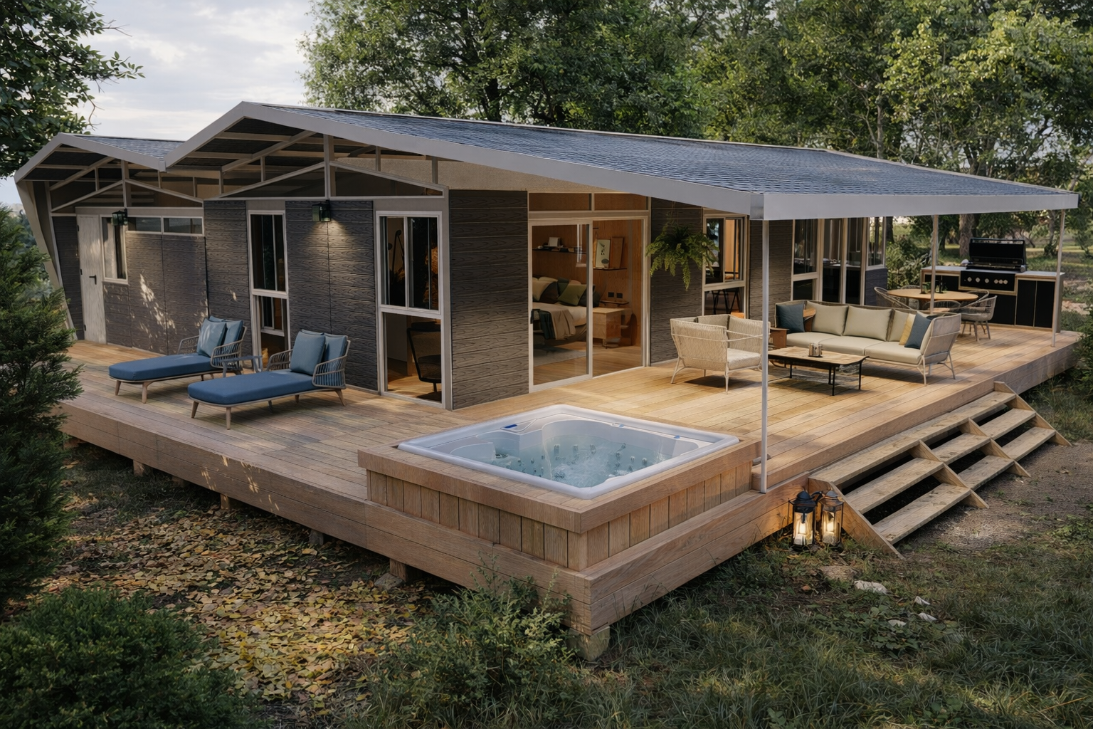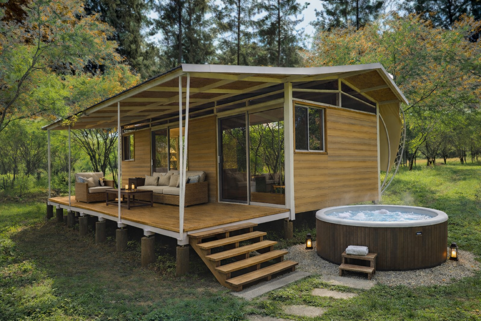 El modelo ideal como pequeña cabaña para renta vacacional. Tamaños desde los 37m2; con 2 o 3 habitaciones y espacio para cocina completa.